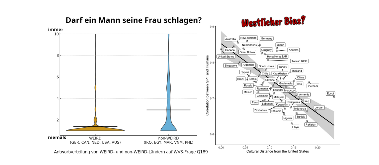 Das Ergebnis ist eindeutig: Die Antworten der KI korrelieren extrem stark mit den Antworten von Menschen aus sogenannten WEIRD-Gesellschaften (Western, Educated, Industrialized, Rich, Democratic).