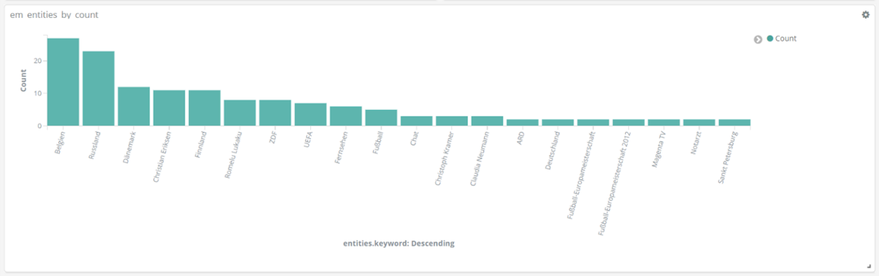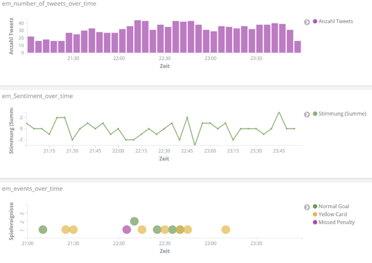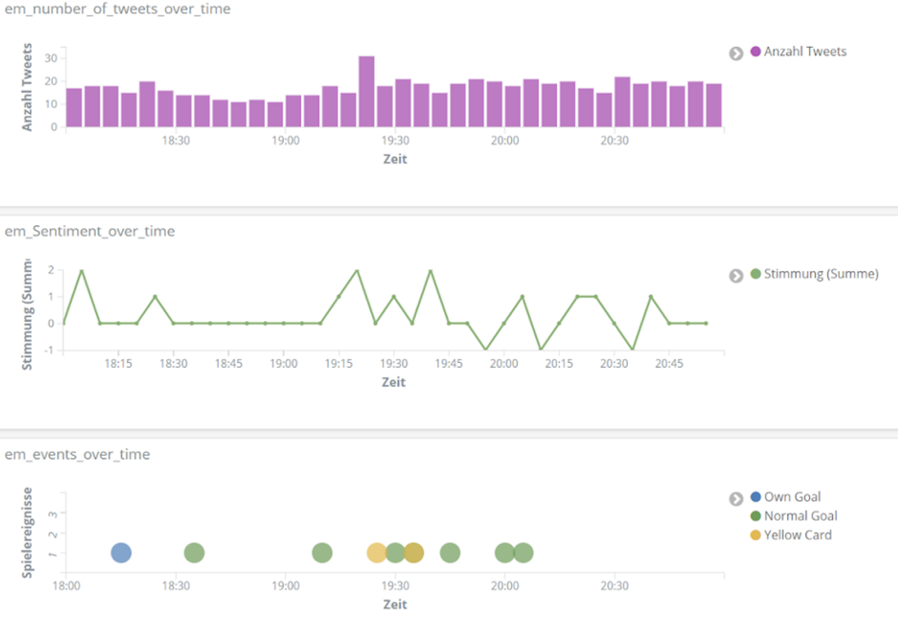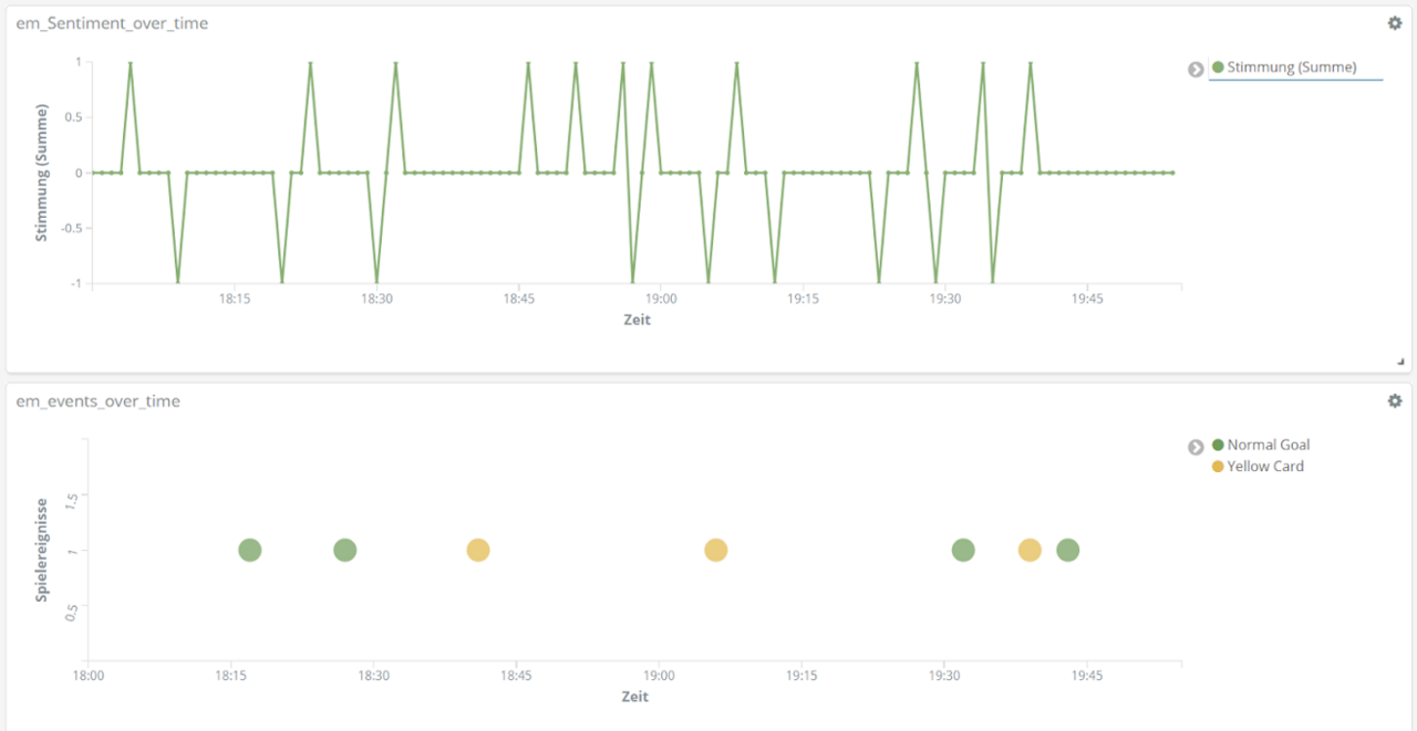 All das analysieren wir mithilfe der Entitäten-Erkennung und der Sentiment-Analyse aus unserem Text Mining Framework TXTWerk sowie dem Open Source Suchsystem Elasticsearch und der dazugehörigen Visualisierungsplattform Kibana. Damit vereinen wir unsere beiden Kernkompetenzen, Suche und Text Mining, zu einem geeigneten Analyse-Tool auch für das Thema Fußball.