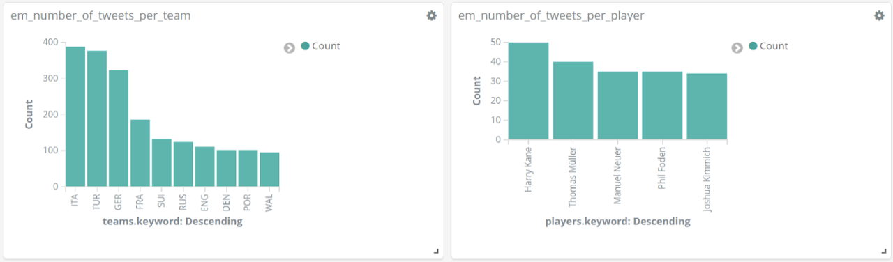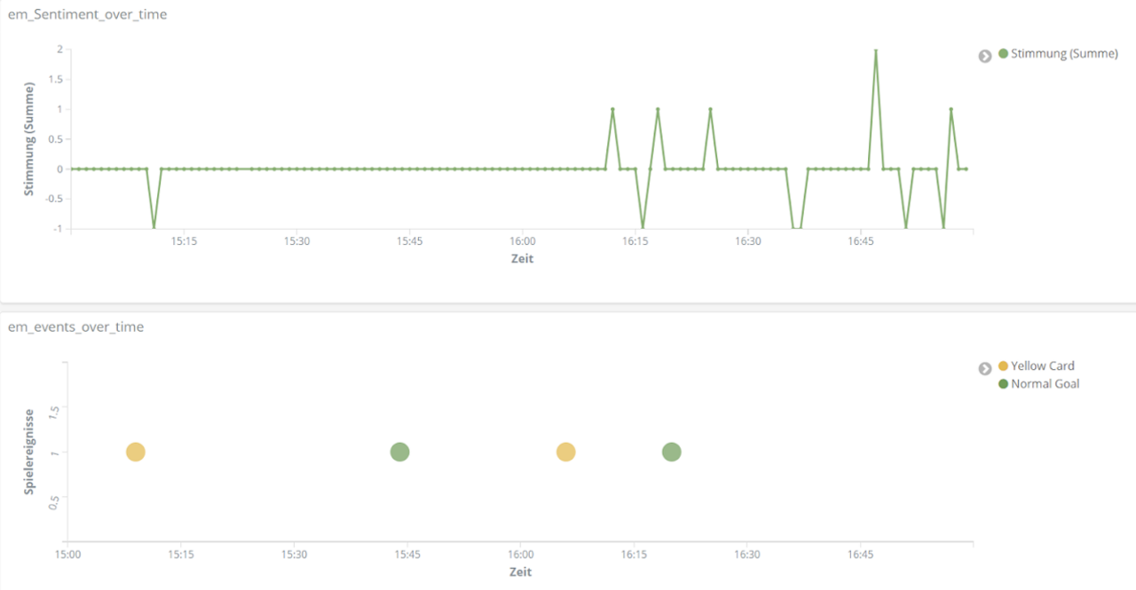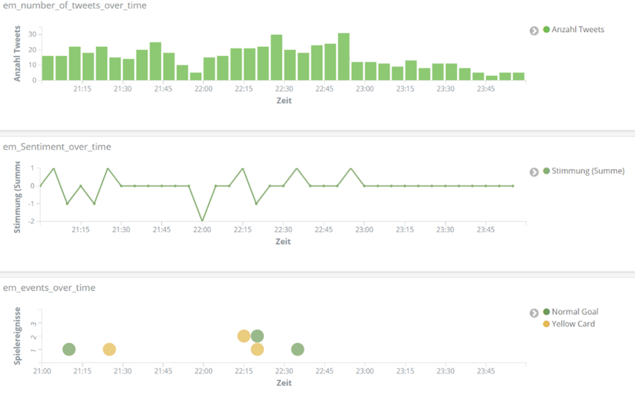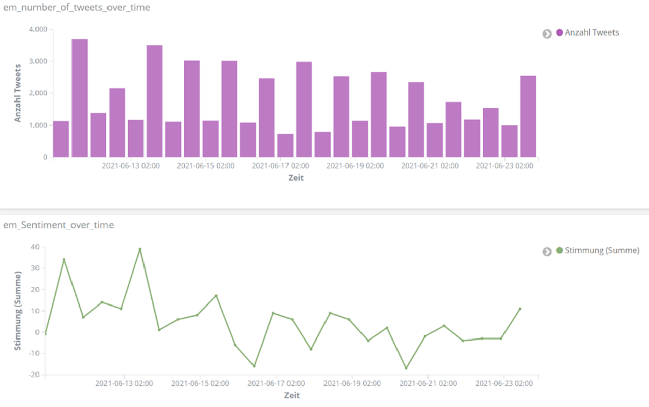 All das analysieren wir mithilfe der Entitäten-Erkennung und der Sentiment-Analyse aus unserem Text Mining Framework TXTWerk sowie dem Open Source Suchsystem Elasticsearch und der dazugehörigen Visualisierungsplattform Kibana. Damit vereinen wir unsere beiden Kernkompetenzen, Suche und Text Mining, zu einem geeigneten Analyse-Tool auch für das Thema Fußball.