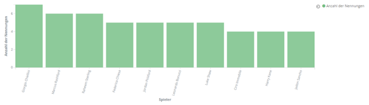 Italien ist der Europameister der EM 2020. Der Weg dorthin war allerdings nicht einfach für die Italiener. Wie schon im Halbfinalspiel gegen Spanien siegte Italien auch gegen England erst im Elfmeterschießen. Sowohl in den 90 Minuten regulärer Spielzeit als auch in der Nachspielzeit konnte keine der beiden Mannschaften das Geschehen dauerhaft dominieren. Auch bei einer Einzelbetrachtung der Spieler fiel keiner der Spieler durch überragende Aktionen auf. Entsprechend selten werden die Spieler beider Teams während des Spiels auf Social Media erwähnt.