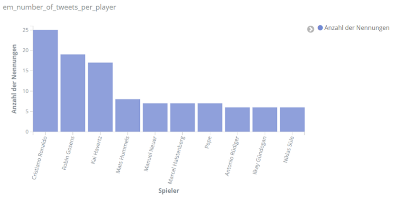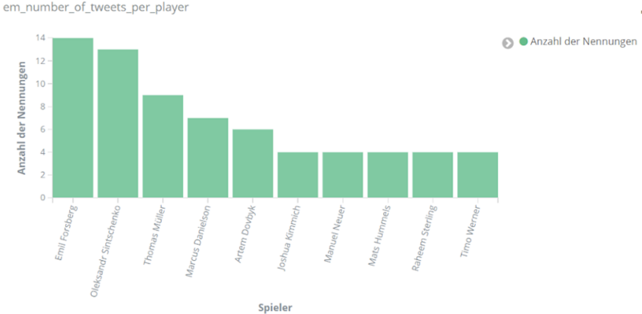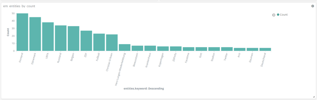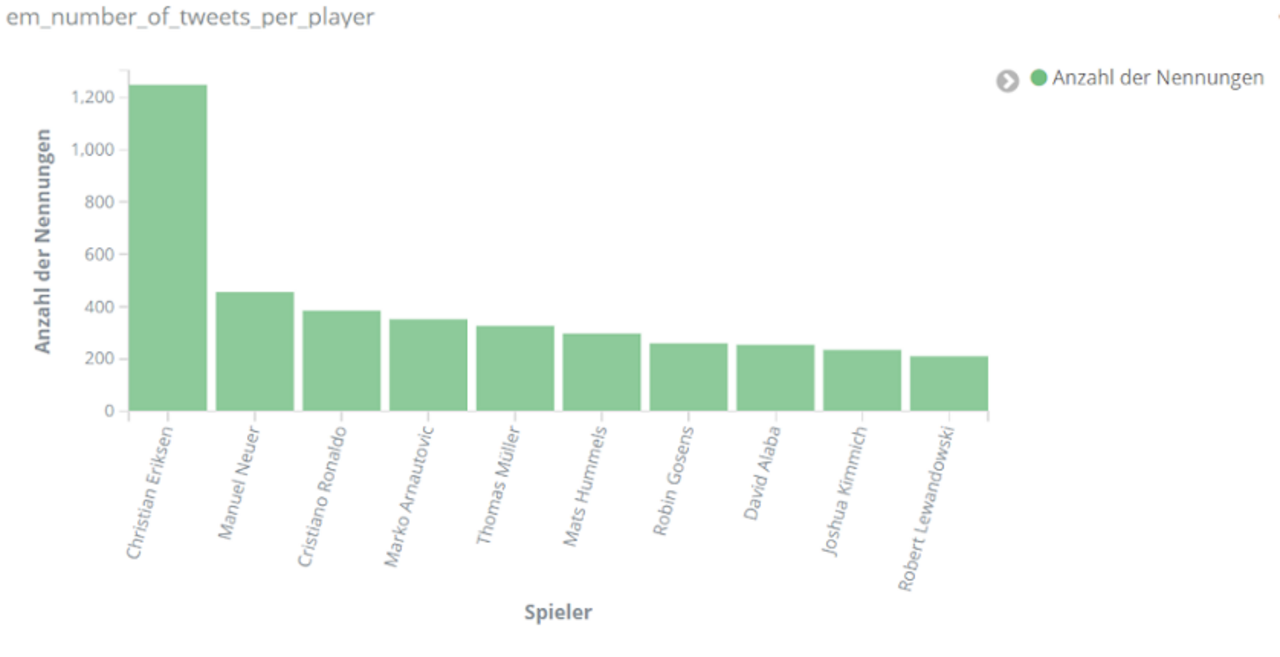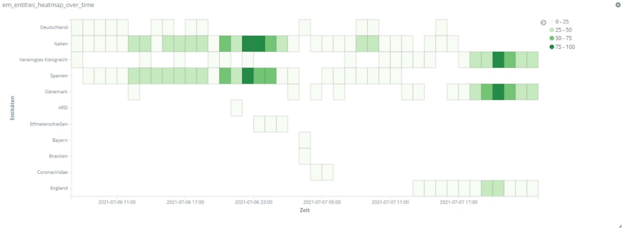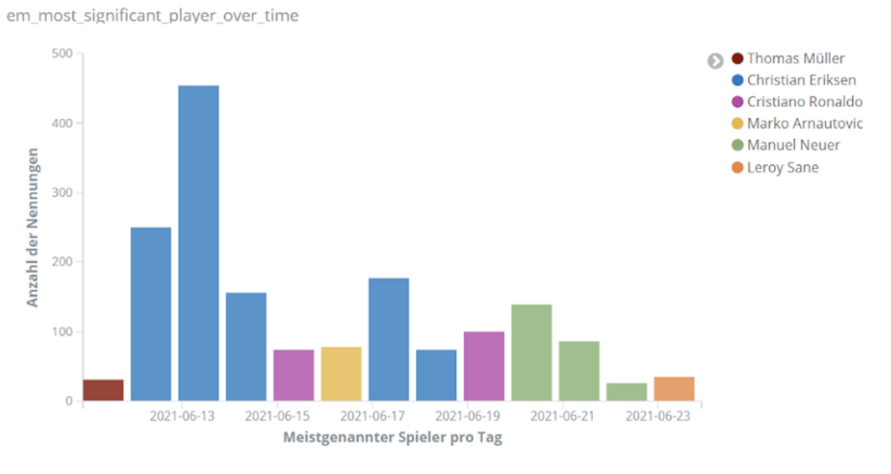 Für echte Aufregung sorgt aber das Spiel Dänemark gegen Finnland am 12. Juni. Dänemarks Spieler Christian Eriksen kollabiert auf dem Spielfeld. Über Stunden dominiert er dementsprechend das Geschehen auf Social Media. Tweets über Eriksen sind um ein vielfaches häufiger als bezüglich anderer Spieler. Unser Text-Mining-Framework findet unter den häufigsten Entitäten für den Zeitraum 18 bis 22.30 Uhr am 12. Juni Begriffe wie “Herz-Lungen-Wiederbelebung”, “Bewusstsein”, “Krankenhaus”, aber auch “Gott” und “Daumen”, die dem Spieler wohl gedrückt wurden.