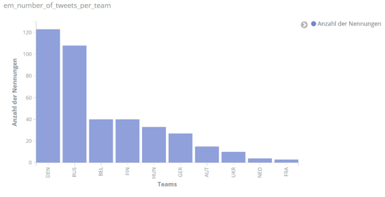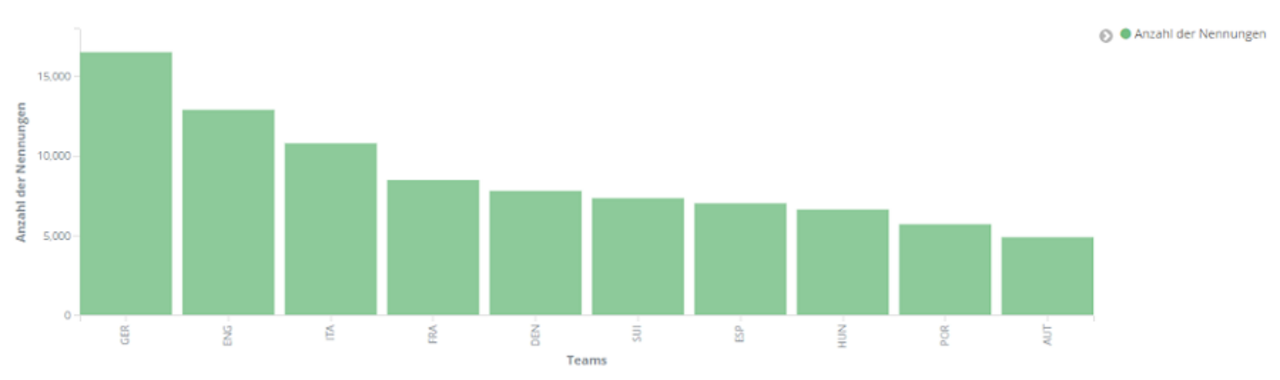 Unabhängig von einzelnen Spielern wurde aber auch den einzelnen Mannschaften der EM verschieden viel Interesse entgegengebracht. Wie zu erwarten bei unserer Analyse, die deutschsprachige Reaktionen in den Vordergrund stellt, erscheint das deutsche Team besonders häufig in den Kommentaren auf Social Media. Mit England und Italien folgen anschließend die beiden Finalisten.