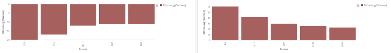 Nachdem die deutsche Mannschaft sich aber schon im Achtelfinale geschlagen geben musste, ist sie nicht nur das Team mit den meisten Nennungen, sondern auch mit den stärksten negativen Reaktionen auf Twitter. Besonders positiv wird dagegen der Meister Italien bewertet.