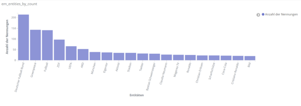 Abschließend betrachten wir, welche Themen die EM 2020 besonders geprägt haben. Unter den Entitäten, die von TXTWerk am häufigsten in den Kommentaren zur EM gefunden wurden, befinden sich mehrere grundsätzliche Themen: