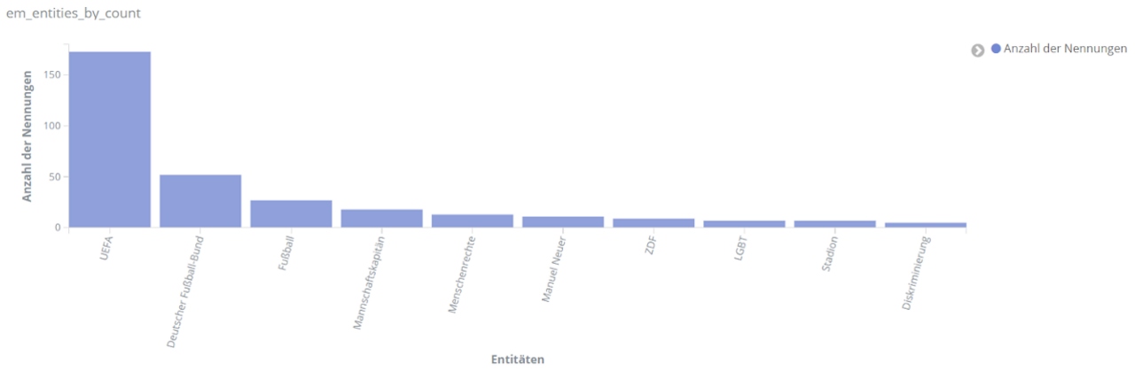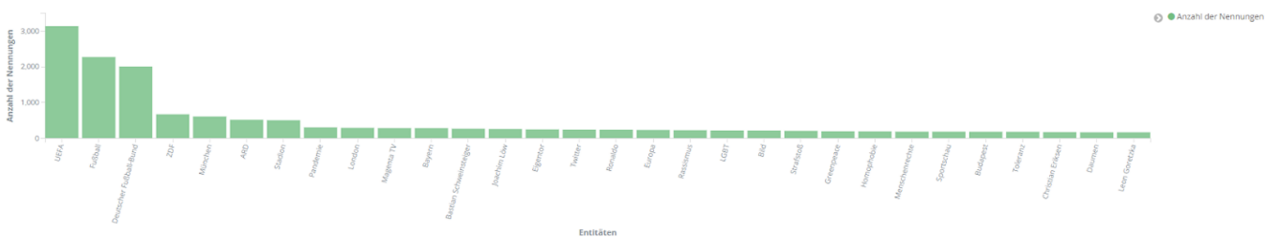 Aber auch die politischen Debatten, die thematisch mit der EM einhergingen, spiegeln sich wider, beispielsweise in Entitäten wie “Pandemie”, “Rassismus”, “LGBT”, “Homophobie”, “Menschenrechte” und “Toleranz”.