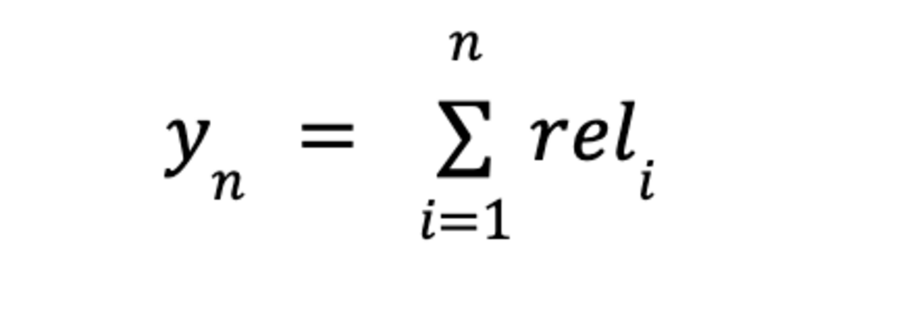 Für NDCG gehen wir als Grundlage zunächst vom sogenannten Cumulative Gain (CG) aus: dieser gibt die Summe aller Relevanzscores der Suchergebnisse an: