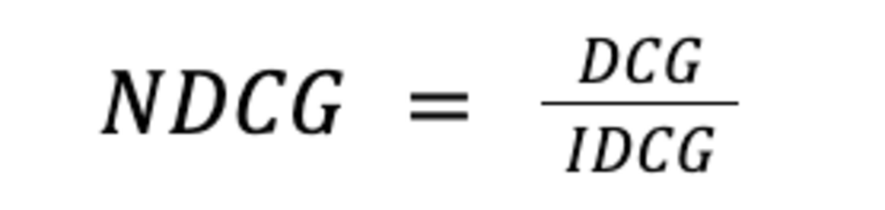 Um nun auf den Normalized Discounted Cumulative Gain (NDCG) zu kommen, wird zusätzlich der Idealwert des DCG berechnet (Ideal Discounted Cumulative Gain - IDCG), also der Wert, den DCG erreichen würde, wenn alle Suchergebnisse optimal nach ihrer Relevanz gerankt wären. Auch hier können also Abstufungen zwischen dem Relevanzgrad einzelner Suchergebnisse miteinbezogen werden.