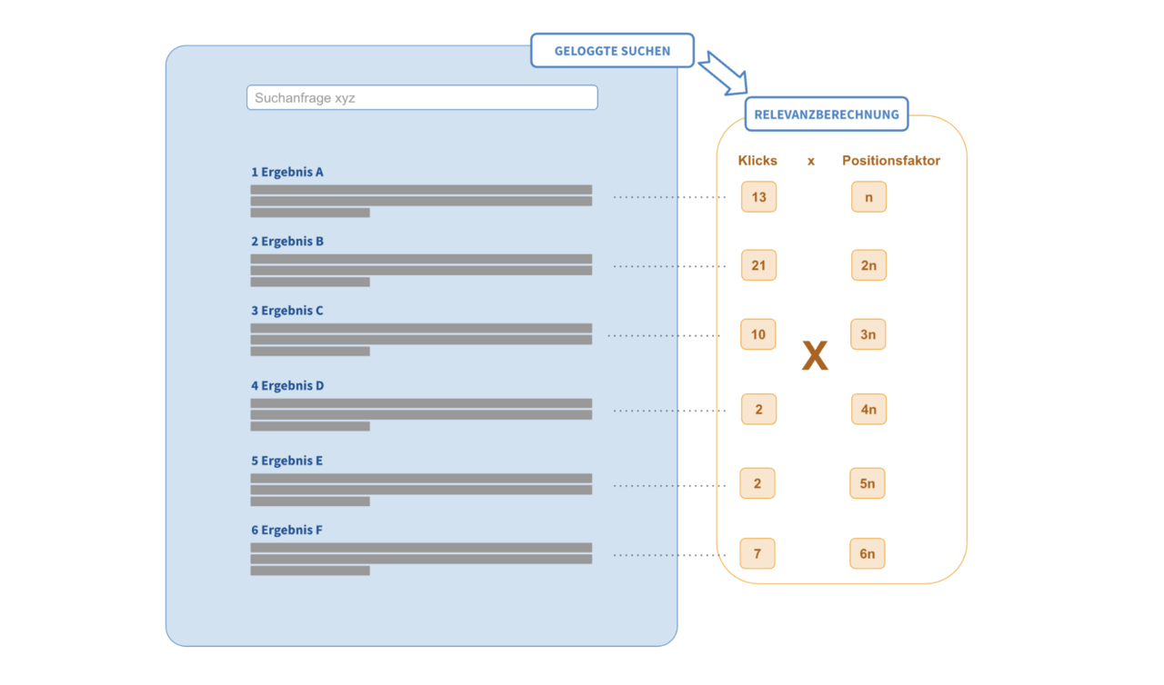 Allerdings sind Nutzer tendenziell bei der Suche etwas voreingenommen: Je weiter oben ein Dokument im Ranking der Suchergebnisse erscheint, desto wahrscheinlicher ist auch, dass es (unabhängig von seiner Relevanz) geklickt wird. Daher lassen wir in die Berechnung des Relevanzwerts auch einfließen, an welcher Position sich das geklickte Dokument in der Suchergebnisliste ursprünglich befand. Dokumente, welche weiter hinten in der Suchergebnisliste standen und trotzdem geklickt wurden, sind relevanter als solche, die genauso oft geklickt wurden, aber weiter vorn standen.