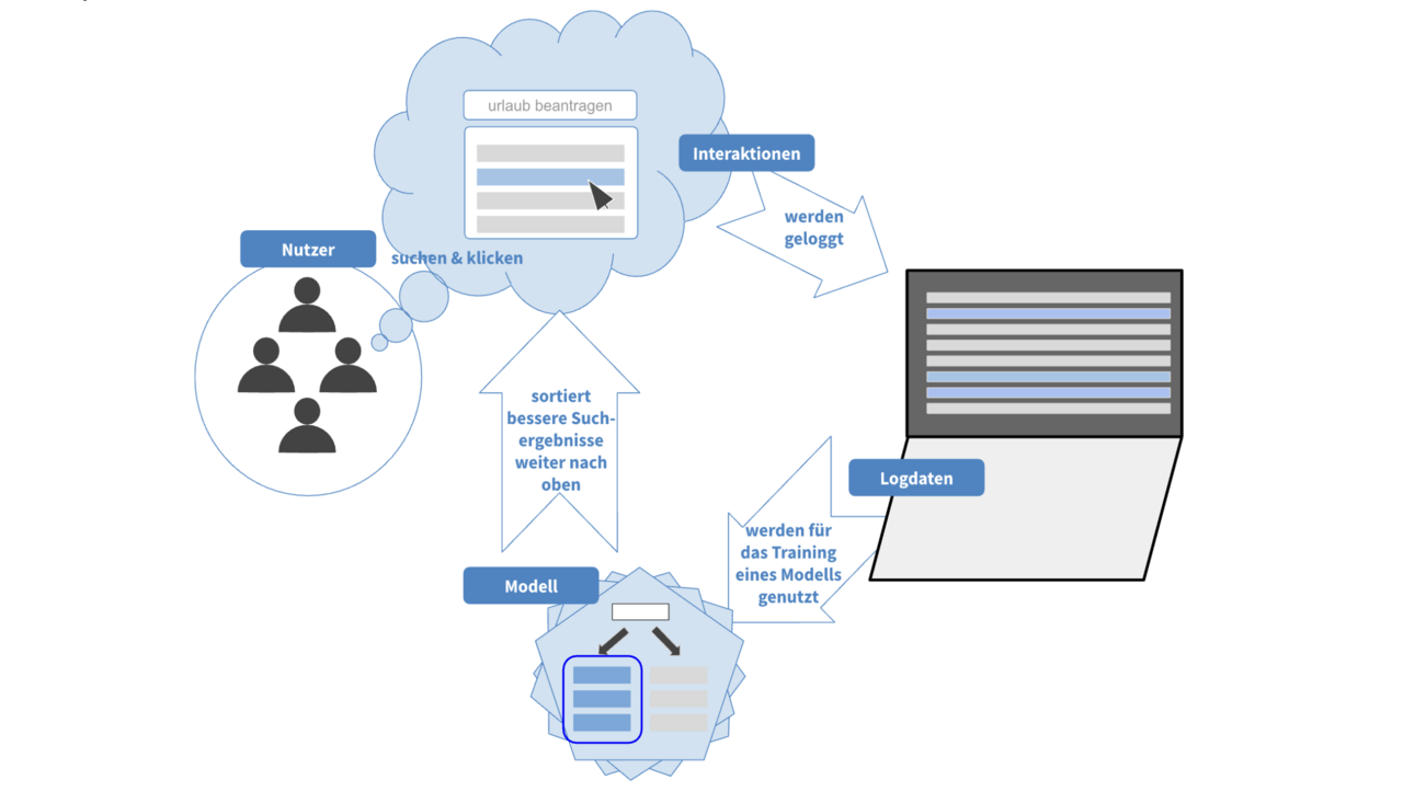 Unsere Herangehensweise für ein Projekt bei einem Versicherungskunden ist es, das Ranking von Suchergebnissen einer internen Suche, die auf Apache Solr basiert, zu verbessern, indem wir mit Methoden des maschinellen Lernens ein geeignetes Modell trainieren. Dieses lernt anhand der Nutzerinteraktionen, welche Suchergebnisse für welche Suchanfragen besonders relevant sind.