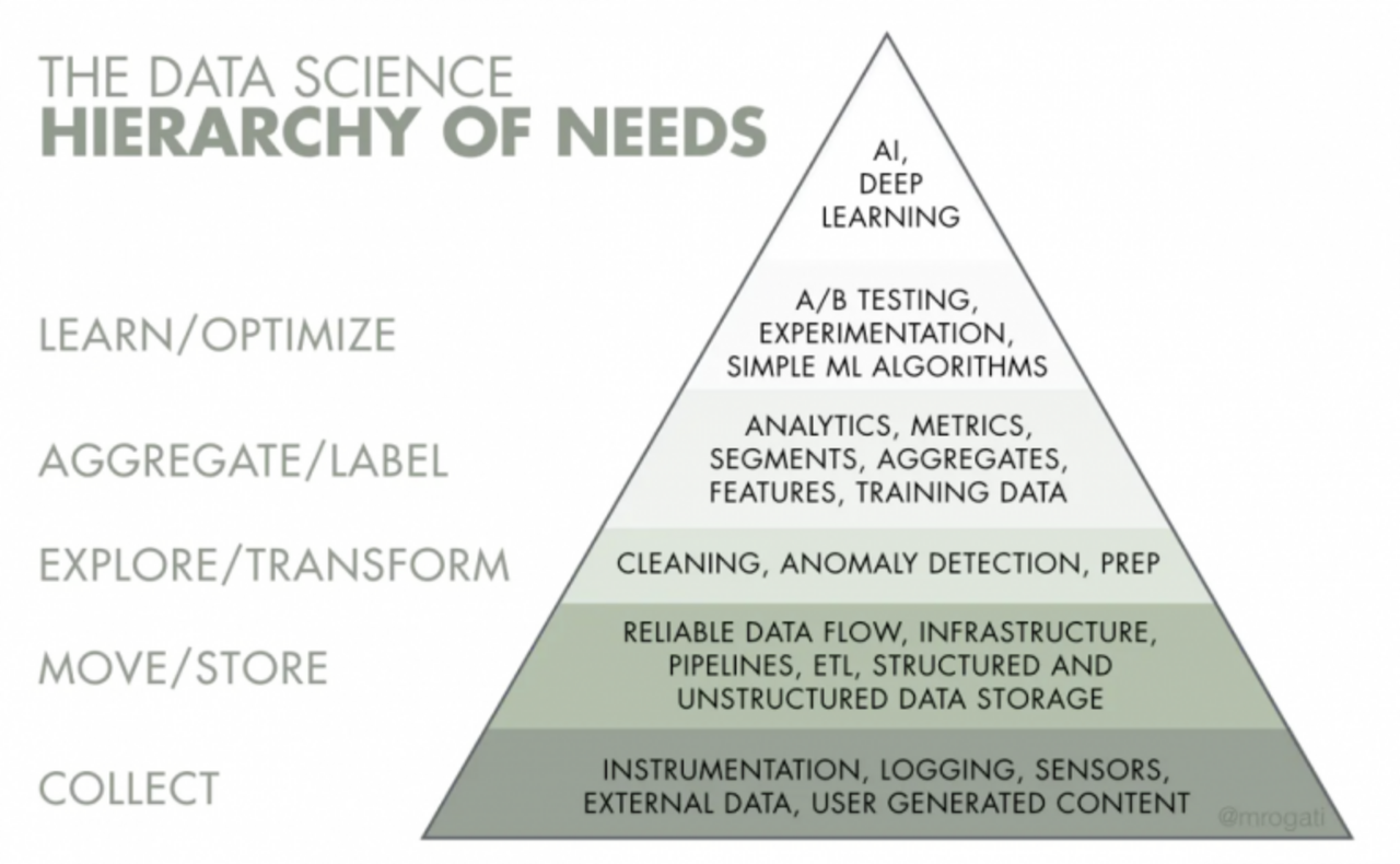 Die Themen KI und Data Science sind eng miteinander verbunden und kurz gesagt versprechen beide, Daten in Informationen umzuwandeln und so einen Mehrwert für das Geschäft zu generieren. Beiden gemein ist jedoch, dass die Anwender meist Daten nutzen, die voller Fehler und voller Lücken sind, die sich über Jahre anhäufen und sich in Format und Bedeutung ändern oder die in einer Weise strukturiert sind, die keinen Sinn ergeben. Trotzdem erwarten die Anwender, korrekterweise nicht die direkten Nutzer, die Data Scientists, sondern eher andere Abteilungen und Entscheider, dass KI auf magische Weise die richtigen Schritte und Schlüsse vollzieht. Das ist allerdings heute nicht der Fall. Deswegen sollte jedes Unternehmen, das sich mit Daten und deren Nutzen befasst, die hierarchy of needs für Data Science Produkte anschauen. Ein KI-Projekt startet nicht mit dem Algorithmus sondern mit den richtigen Daten und deren Sammlung.