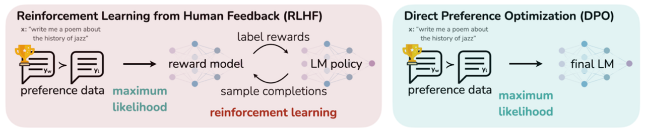 DPO ist eine ressourcensparsame Alternative zu RLHF, welches einen der größten Nachteile von RLHF beseitigt: Für RLHF müssen drei Modelle im teuren VRAM gehalten werden: das Ausgangsmodell, das Belohnungsmodell und das zu optimierende Modell. DPO führt Gradientenabstieg direkt auf dem zu optimierenden Modell durch. Es kommt also ohne Belohnungsmodell und Reinforcement Learning aus.
