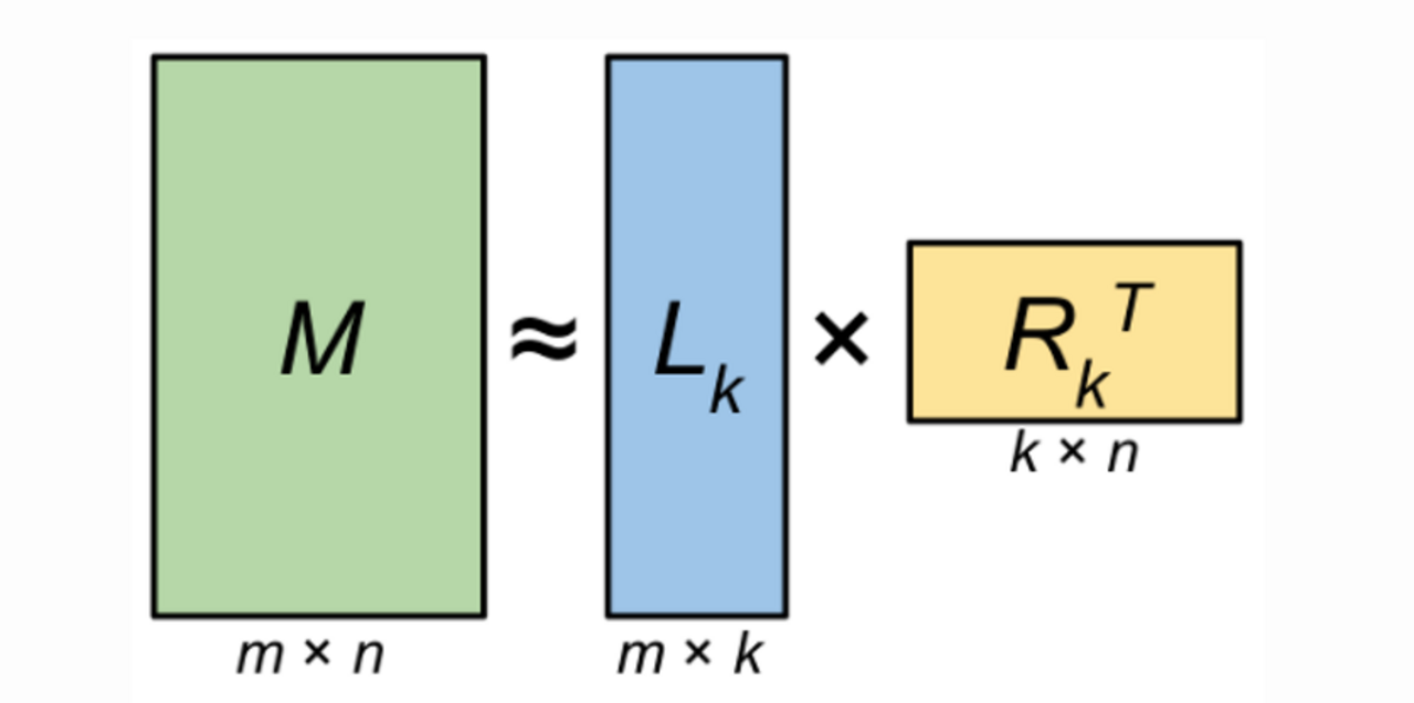 Bei der Low rank factorization oder low-rank approximation werden lineare Algebra-Techniken verwendet, um die Embedding Matrix zu komprimieren. Das kann mithilfe der singular value decomposition (SVD) erreicht werden. Wie auf dem Bild gezeigt, kann eine Matrix M von Größe m⨯n und mit dem Rang r, aus den Matrizen Lkund Rkerzeugt werden. Wenn k = rgilt, kann die Matrix aus der Zerlegung genau rekonstruiert werden. Und wenn k < rgilt, bietet die Zerlegung ein low-rank approximation von M an. Eine Annäherung mit niedrigem Rang ist oft nützlich, wenn die Matrix M Informationen enthält, die ignoriert werden können. Das gilt z. B. bei redundanten Informationen oder irrelevanten Informationen, die für die Lösung eines bestimmten numerischen Problems nicht hilfreich oder möglicherweise sogar nachteilig sind.