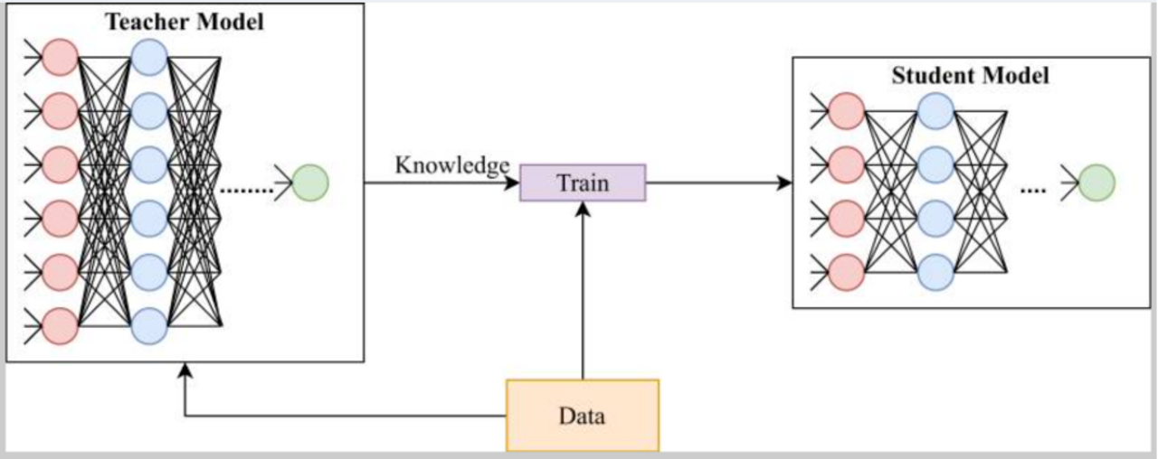 Während die ersten drei Ansätze versuchen, unwesentliche Parameter eines großen Modells zu identifizieren und zu entfernen, um so eine Modellkomprimierung und -beschleunigung zu erreichen, verfolgt die knowledge distillation die Idee, Wissen von einem größeren Modell auf ein kleineres zu übertragen.