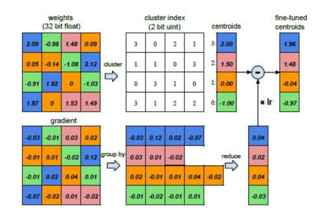 In dem unten aufgeführten Beispiel waren zunächst 32 Bits*16 = 512 Bits erforderlich, um sie darzustellen. Nach der Quantisierung werden nur noch 32 Bits *4 + 2 Bits*16 = 160 Bits benötigt, um sie darzustellen. Beim fine-tuning wird der Gradient für alle Gewichte, die zur gleichen Farbe gehören, summiert und dann vom Schwerpunkt abgezogen. Dadurch wird sichergestellt, dass die bei der Quantisierung vorgenommene Clusterbildung beim fine-tuning beibehalten wird.
