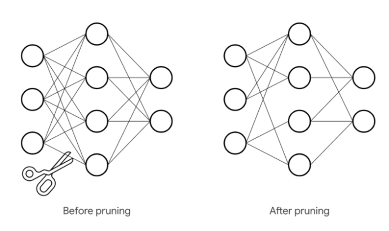 Beim Pruning wird versucht, redundante Verbindungen in der Architektur zu entfernen. Dabei werden irrelevante Gewichte, die in der Regel als Gewichte mit kleinem Absolutwert definiert sind, herausgeschnitten. Nach dem Pruning erfolgt ein fine-tuning des Modells, um die Genauigkeit wiederherzustellen. Hierbei können voll verknüpfte Schichten und Convolutional Neural Networks (CNN) in der Regel bis zu 90 % reduziert werden, ohne an Genauigkeit zu verlieren.