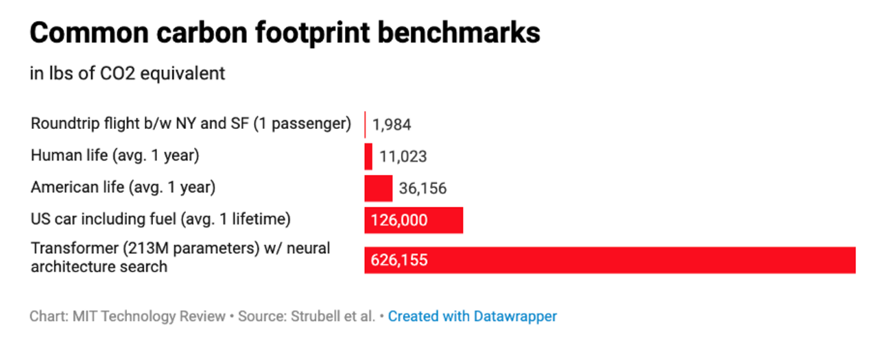 In einer aktuellen Untersuchung Energy and Policy Considerations for Deep Learning in NLP von Forschern der University of Massachusetts, Amherst, wurde eine Lebenszyklus-Analyse für das Training mehrerer gängiger großer KI-Modelle erstellt. Darin wurden die finanziellen und ökologischen Kosten für das Training von aktuell erfolgreichen, neuronalen Netzwerkmodellen für NLP quantifiziert und approximiert. Wie das folgende Diagramm zeigt, kosten die Trainingsprozesse von einem Transformer-Modell mit 213 Millionen Parametern fünfmal so viel Energie wie die Lebensdauer eines durchschnittlichen US-Autos. Die konkreten Zahlen verdeutlichen das Ausmaß des Problems.