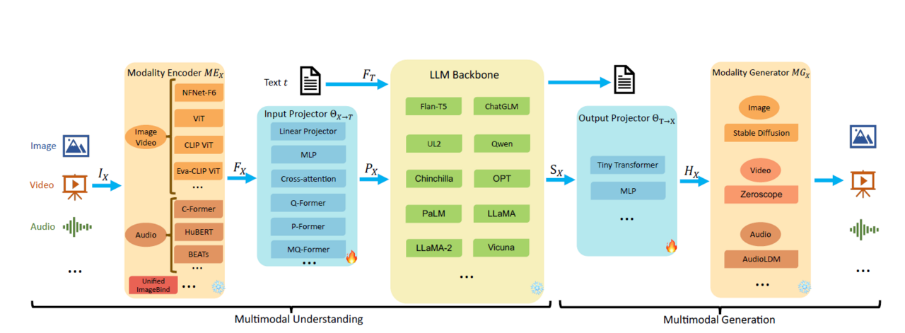 LLM-Backbone: Dies ist die Kernkomponente des Multimodalen-LLM (MM-LLM). Sie nutzt die verarbeiteten Informationen aus den verschiedenen Modalitäten, um Aufgaben wie Textgenerierung, Fragenbeantwortung oder Inhaltserstellung durchzuführen. Bekannte LLMs sind beispielsweise Flan-T5, Qwen und LLaMA.
