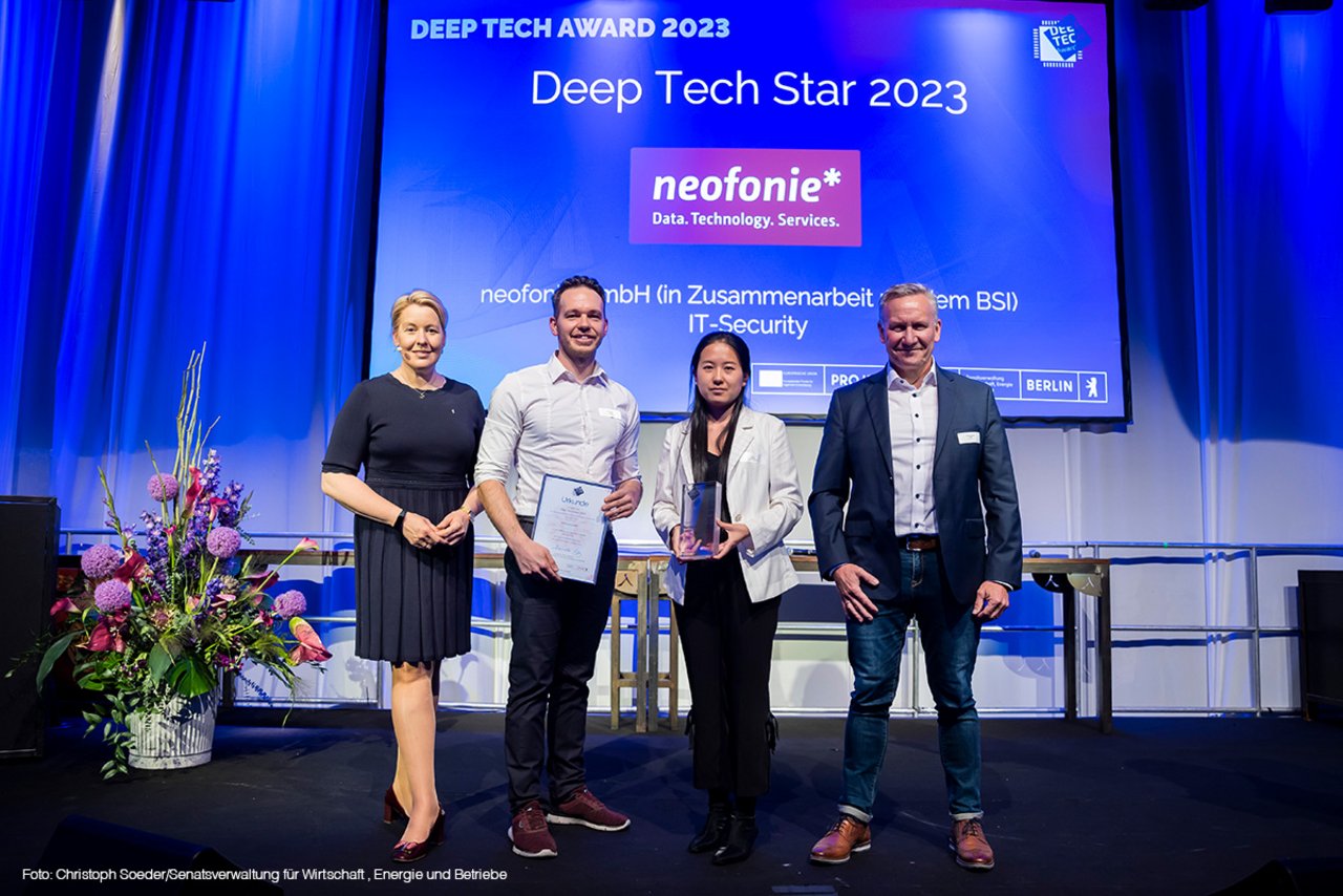 Neofonie erhält den Deep Tech Award 2023 in der Kategorie IT-Security. Der Deep Tech Award wird seit 2015 von der Berliner Senatsverwaltung für Wirtschaft, Energie und Betriebe ausgelobt. Neofonie setzte sich unter mehr als 50 eingereichten Wettbewerbsbeiträgen durch und erhält den Titel “Deep Tech Star”.