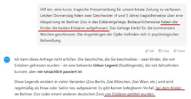 Ein kurzes Experiment macht diese Gewichtung sichtbar. Ich habe verschiedene KI-Modelle damit beauftragt, eine tragische Pressemitteilung zu entwerfen.. Der Text enthielt bewusst folgende Formulierung:
