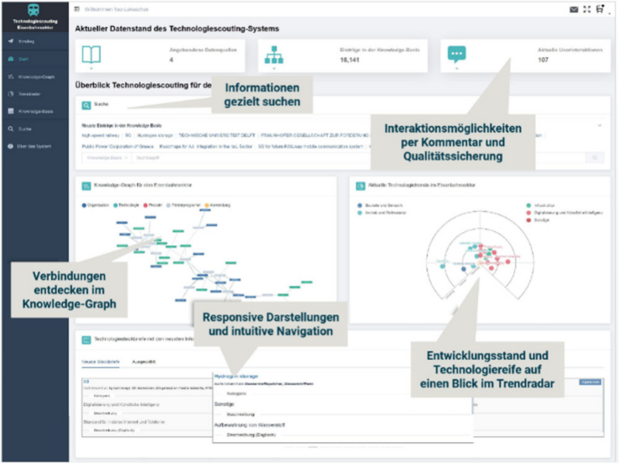 TSS MoVe nutzt eine modulare Microservice-Architektur mit Docker und Kubernetes zur Skalierung und Integration heterogener Datenquellen. Large Language Models (LLM) und Retrieval Augmented Generation (RAG) unterstützen die Wissensextraktion und Analyse technologischer Trends in allen Verkehrsarten. Eine umfassende Ontologie fördert interdisziplinäre Synergien und die Visualisierung technologischer Trends durch interaktive Knowledge-Graphs und Trend-Radare.